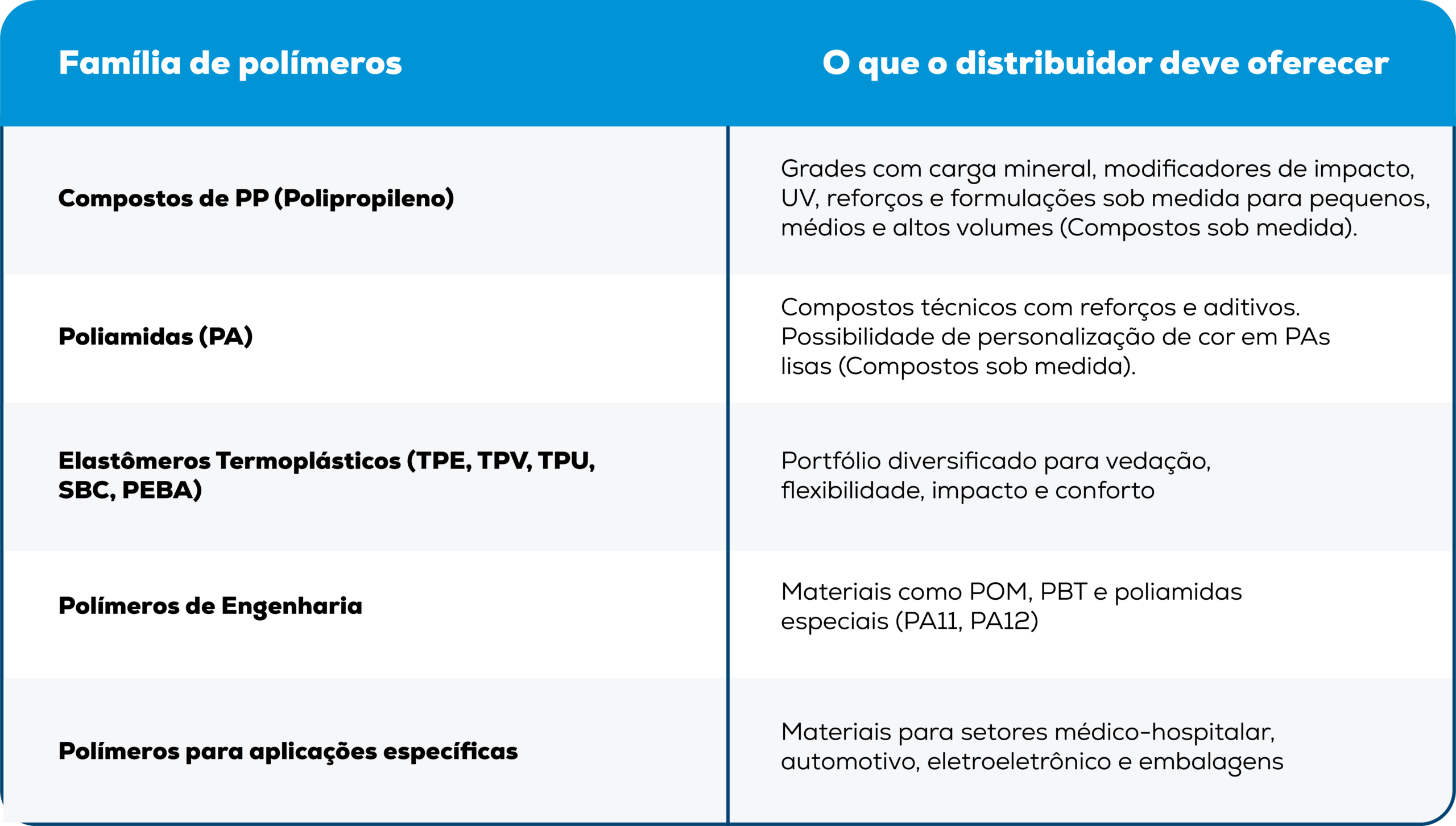 - Suporte técnico consultivo, para indicar o material ideal (seja PP modificado, PA de engenharia ou elastômeros como TPV);